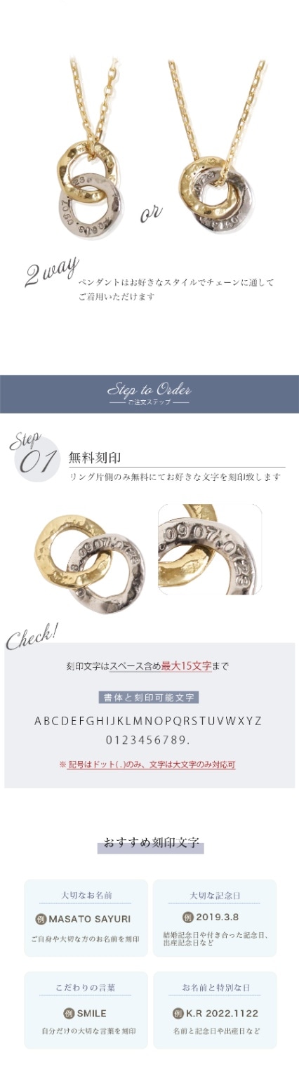 またオプションで両方のリングに刻印も可能なため、名前と誕生日、イニシャルと記念日など無限の組み合わせで唯一無二のオリジナルジュエリーをお造りいただけます。