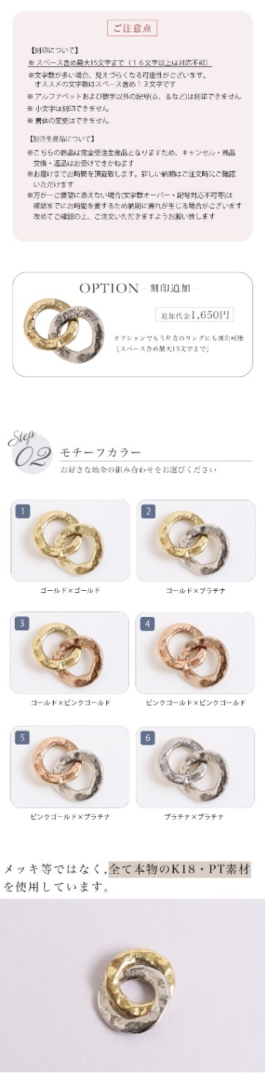 金種は18金イエローゴールド(K18YG)、18金ピンクゴールド(K18PG)、プラチナ(Pt950)の3色からお好きな組み合わせでカスタマイズが可能です。